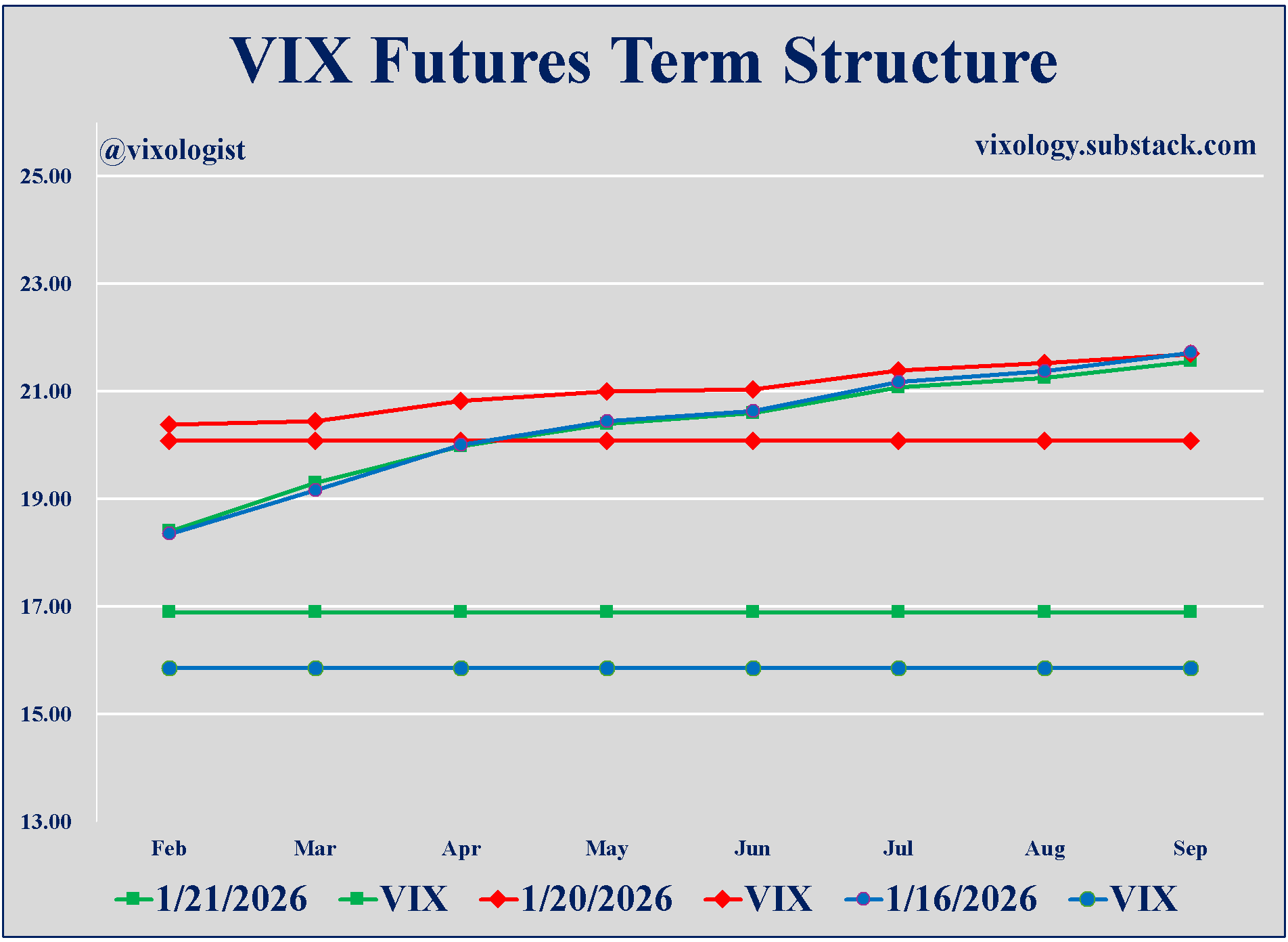 Looking at the VIX futures term structure, we get another picture of “nevermind.” While spot VIX remained elevated relative to last Friday, the futures term structure dropped right back on top of Friday’s curve. That’s an almost eerie example of short-term memory.