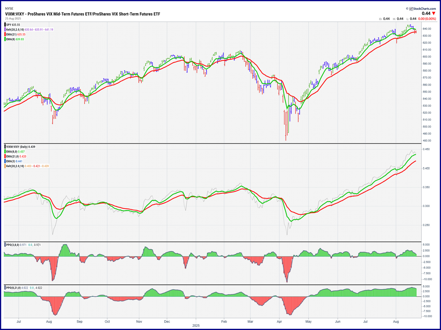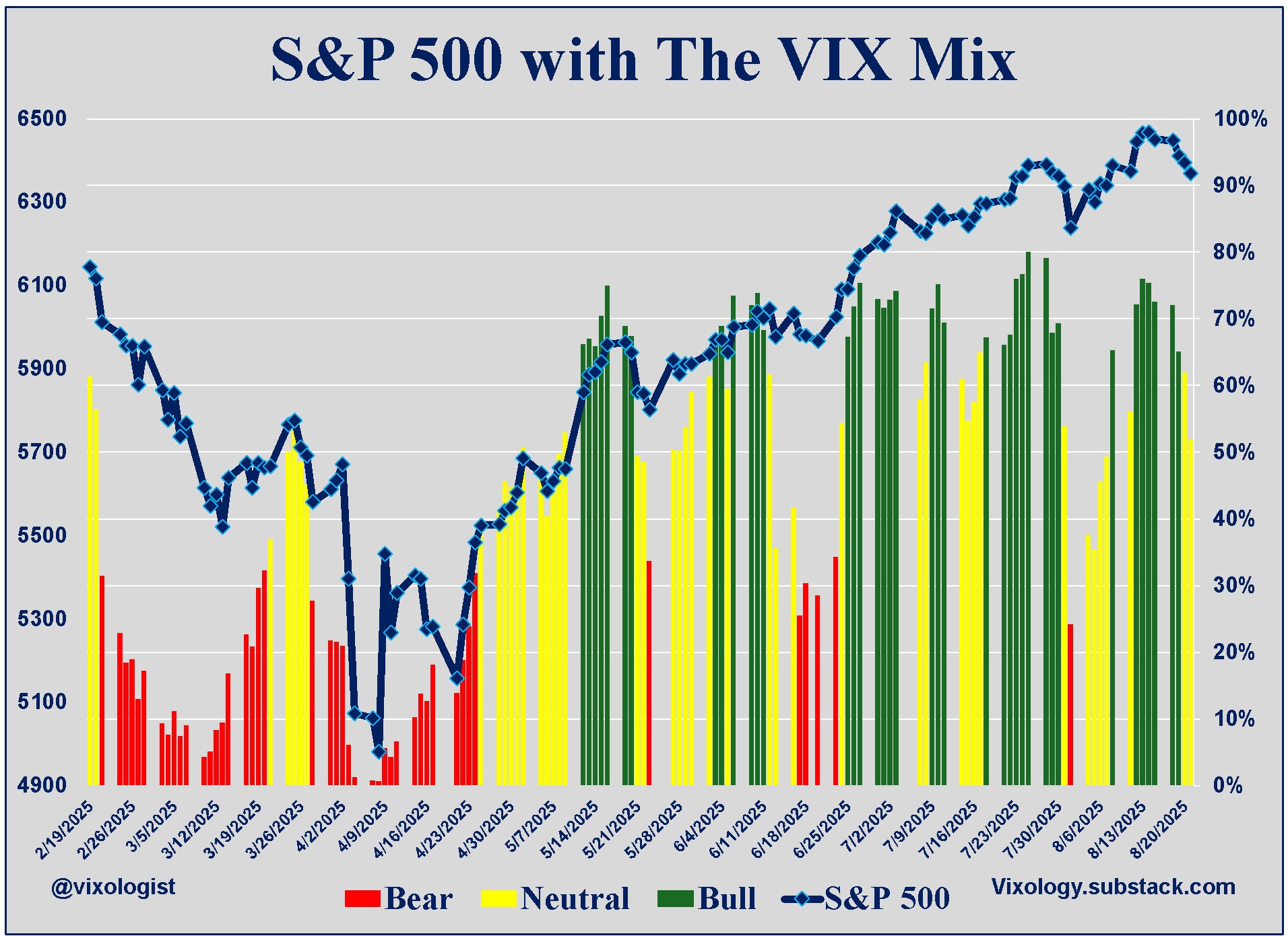 We can’t be surprised that markets are showing signs of apprehension. Our volatility composite, The VIX Mix, retreated further into neutral territory yesterday with only five of 17 components still bullish while four check in on the bearish side. Investors view Powell’s speech as a potential source of turmoil even as the odds of a September rate cut remain high. The mystery White House announcement only adds to concerns.