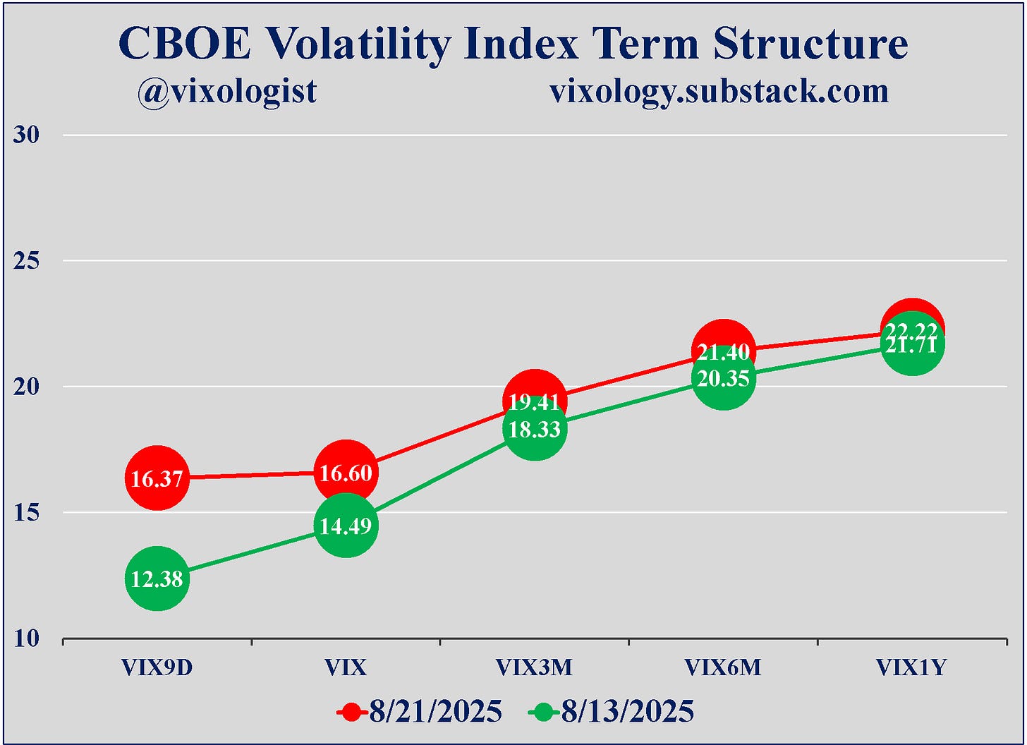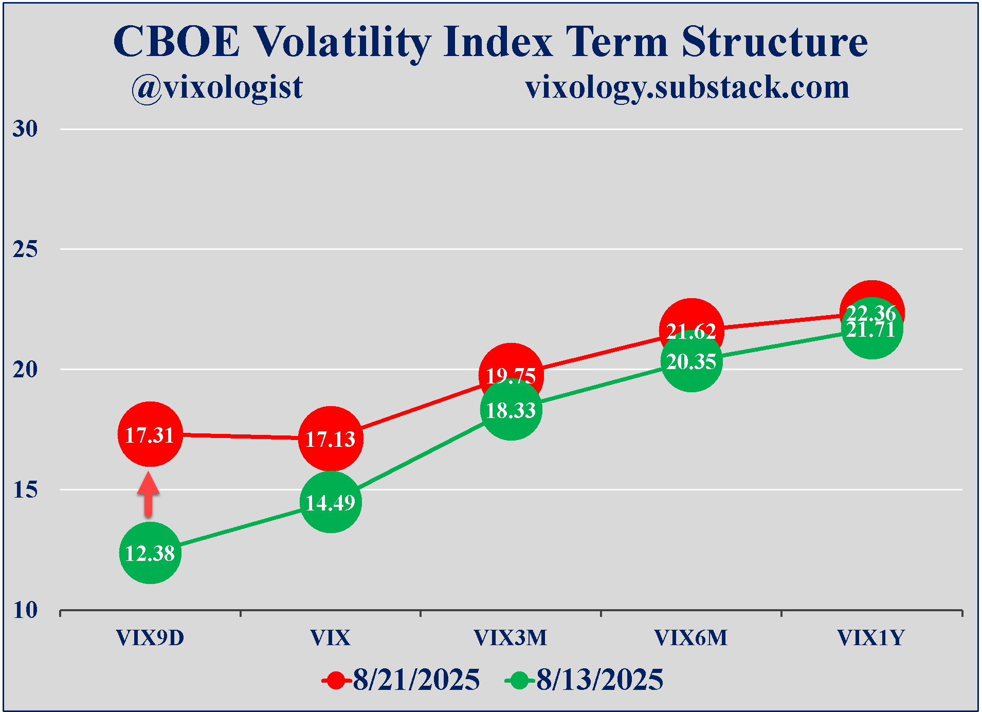 In the middle of yesterday’s regular trading hours, we saw these worries push VIX9D north of VIX as investors focused on short-term risks. The chart below shows this intraday worry and compares that term structure with the recent term structure lows on August 13th.