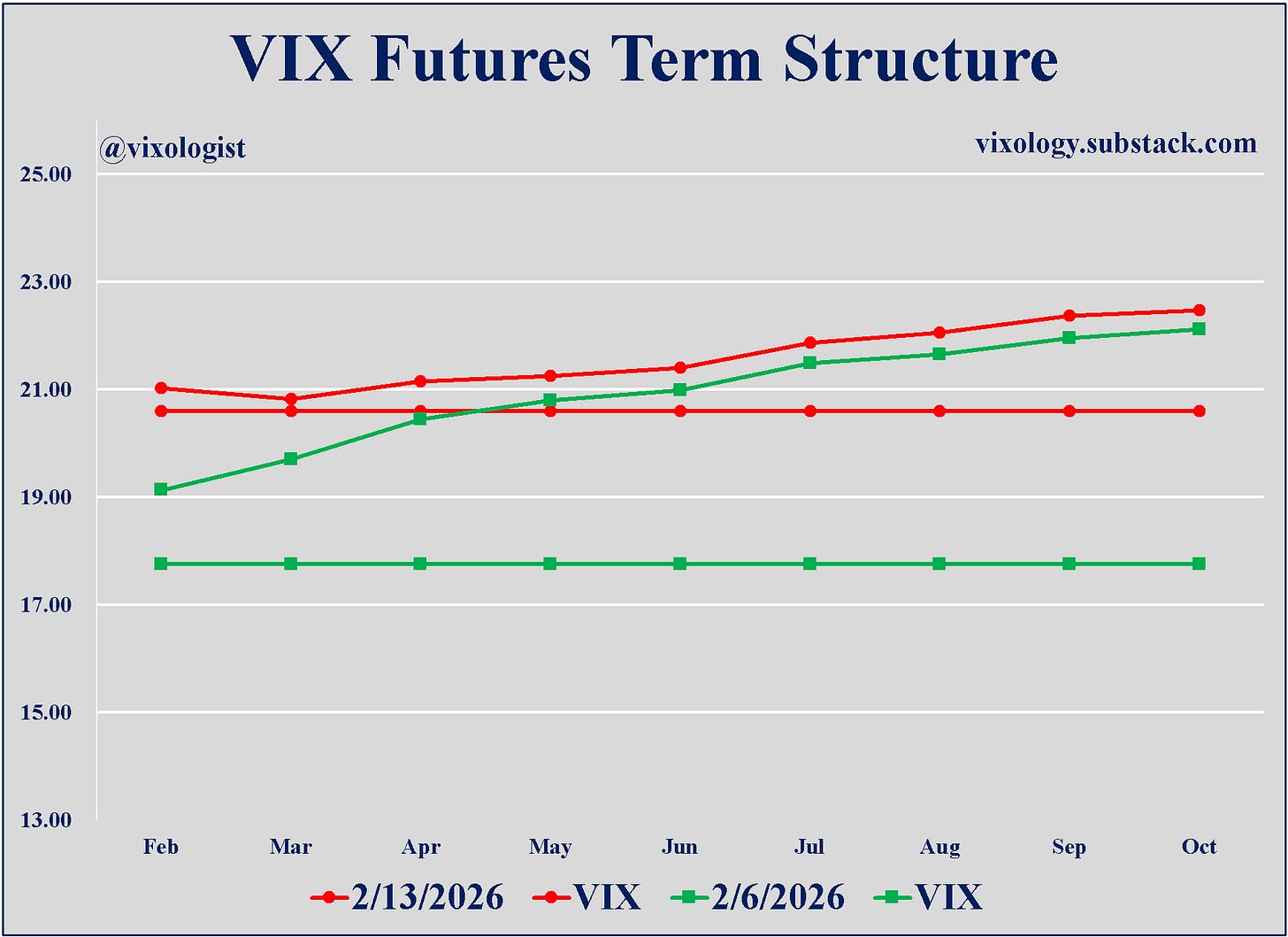 If there’s one chart to sum up the mood in the volatility complex, it would be the week over week change in the VIX futures term structure. Spot VIX rose almost three points with the effect of flattening the futures and producing nice returns for the long volatility exchange-traded products like VXX, VIXY and UVIX.