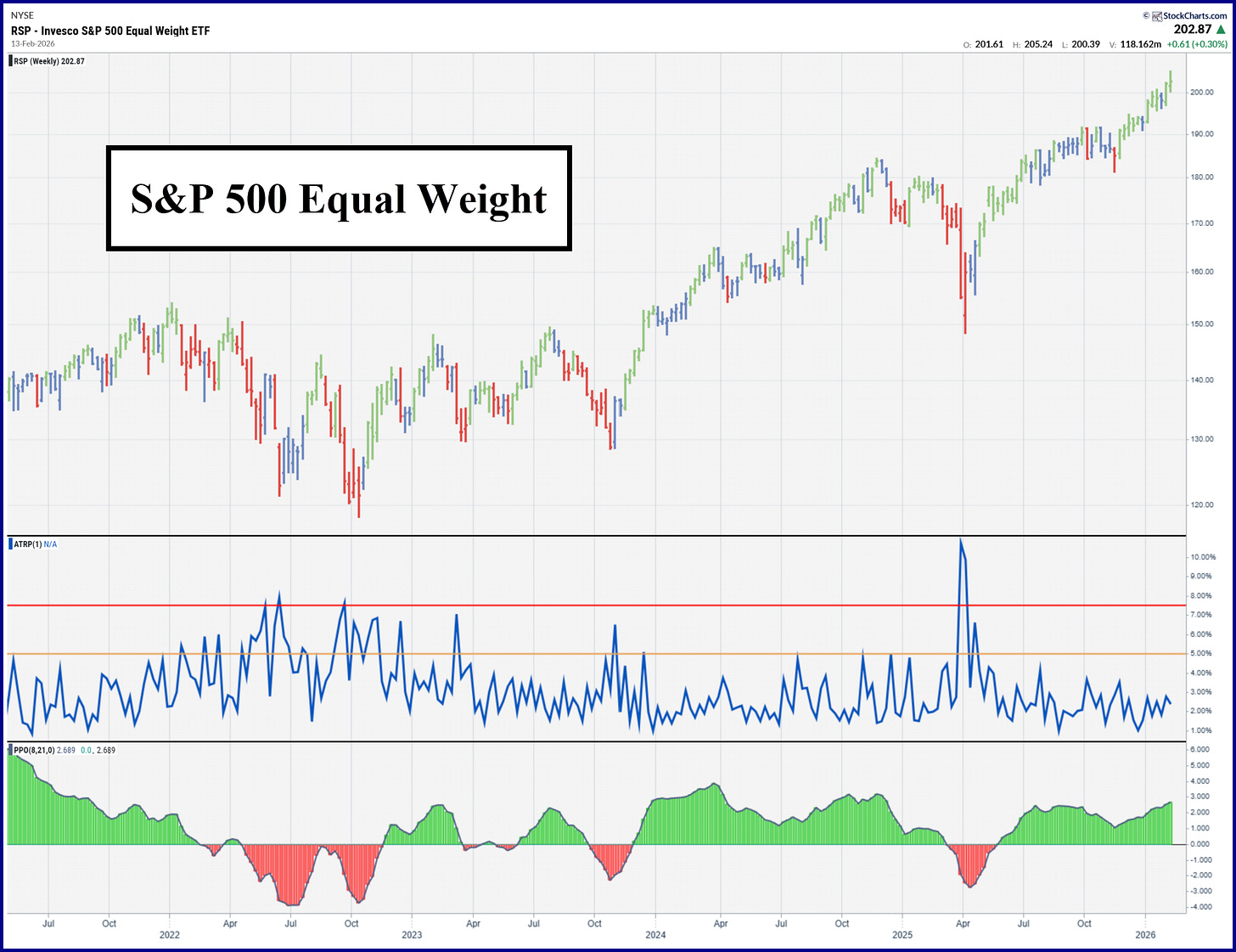This divergence is telling us that investors have not been “all-in” on the move higher for equities. Even so, zooming out to a weekly view, the US equity markets display uptrends that remain intact. Only one red bar on the far right for the S&P 500, and two for the Nasdaq 100. Both of those indices are dominated by large cap technology companies. On the other hand, the Russell 2000 small caps look very healthy and the equal weight S&P 500 (RSP) is the best of them all with new highs registered each of the past two weeks.