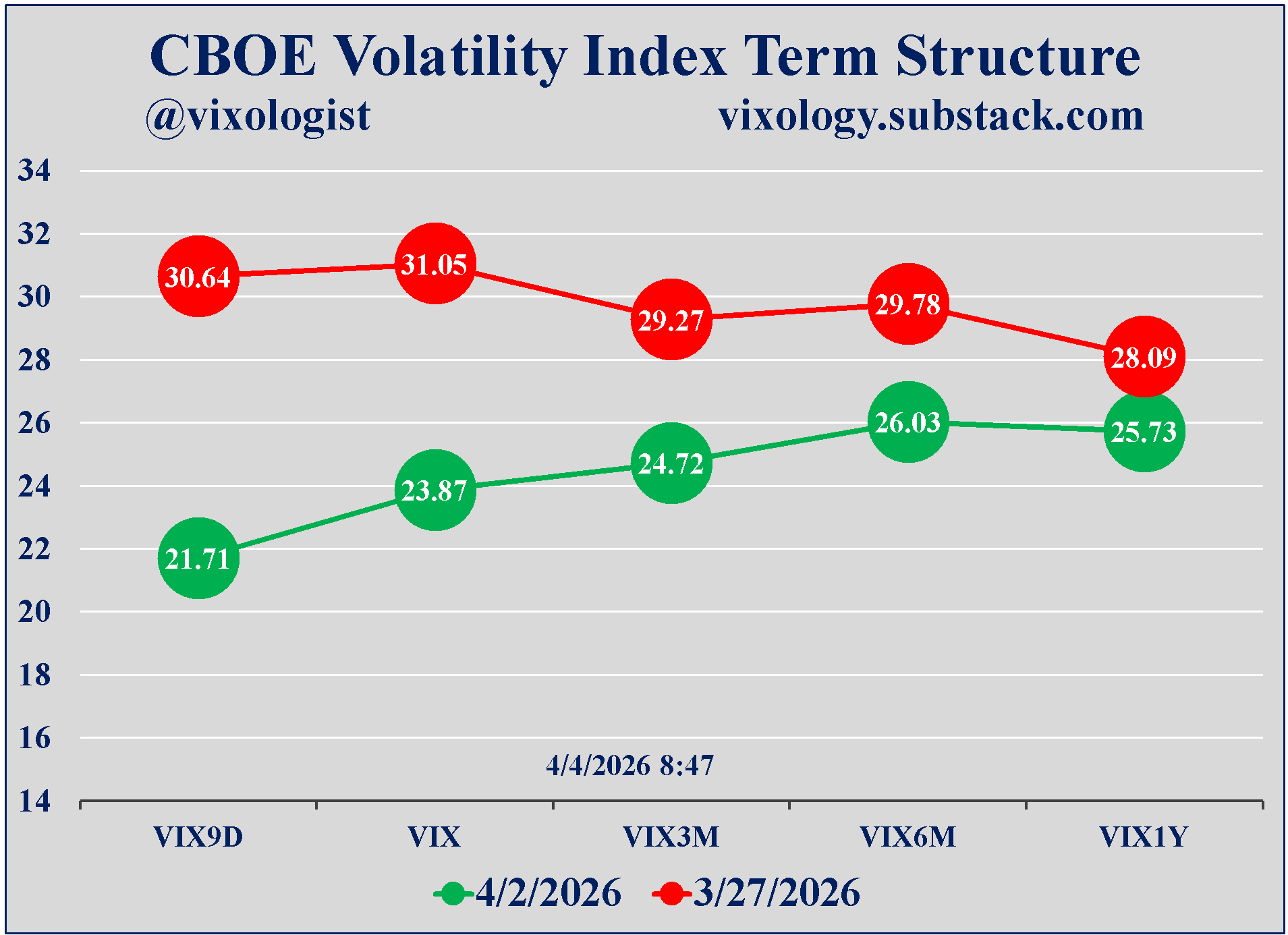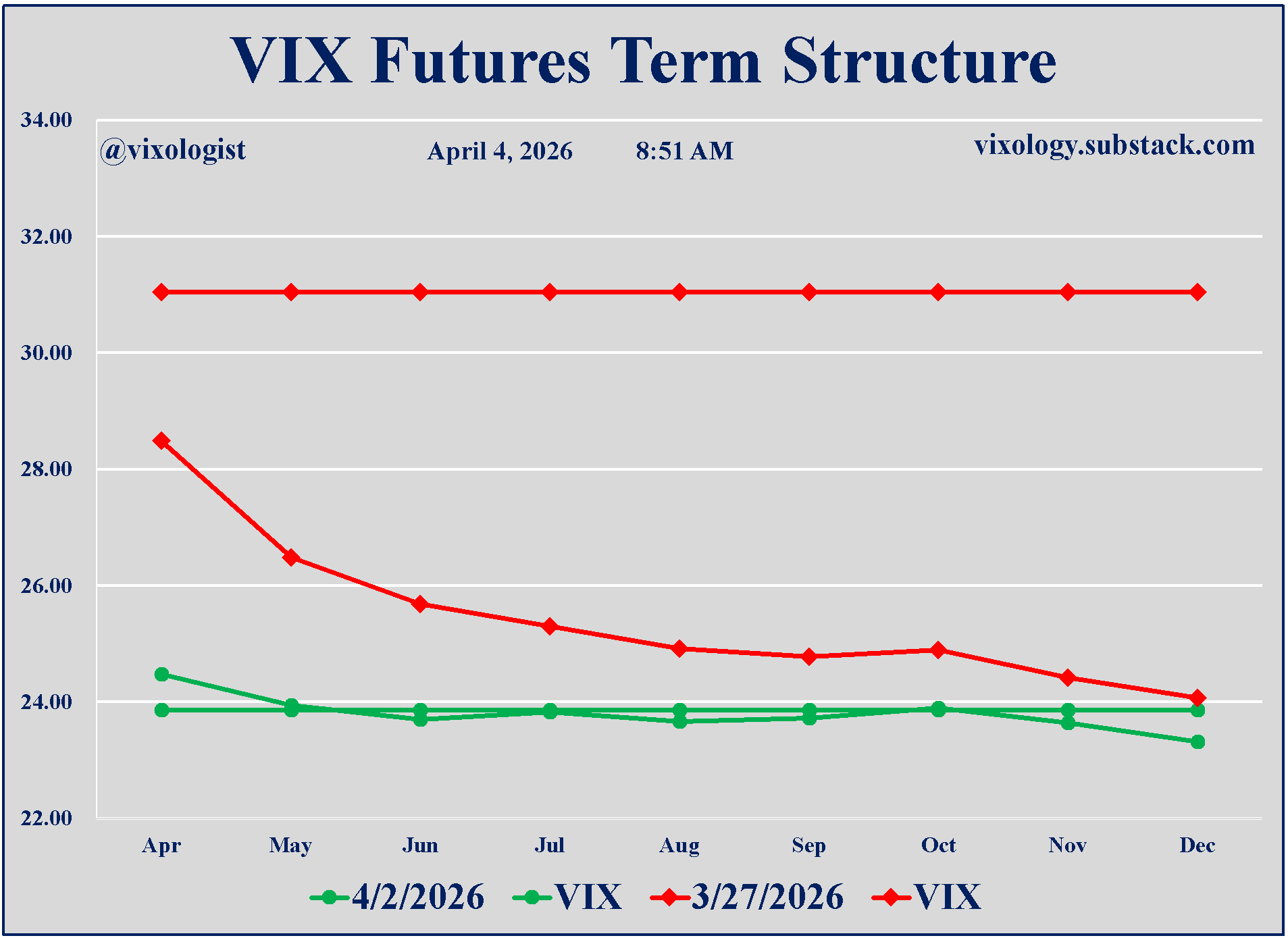 The term structure of the VIX futures and its relationship to spot VIX shows a stark contrast between 3/27 and 4/2. We still have a touch of backwardation from April to June, but nothing compared to the prior Friday. And spot VIX dropped more than seven points! That’s not a world record, but it’s pretty dramatic.