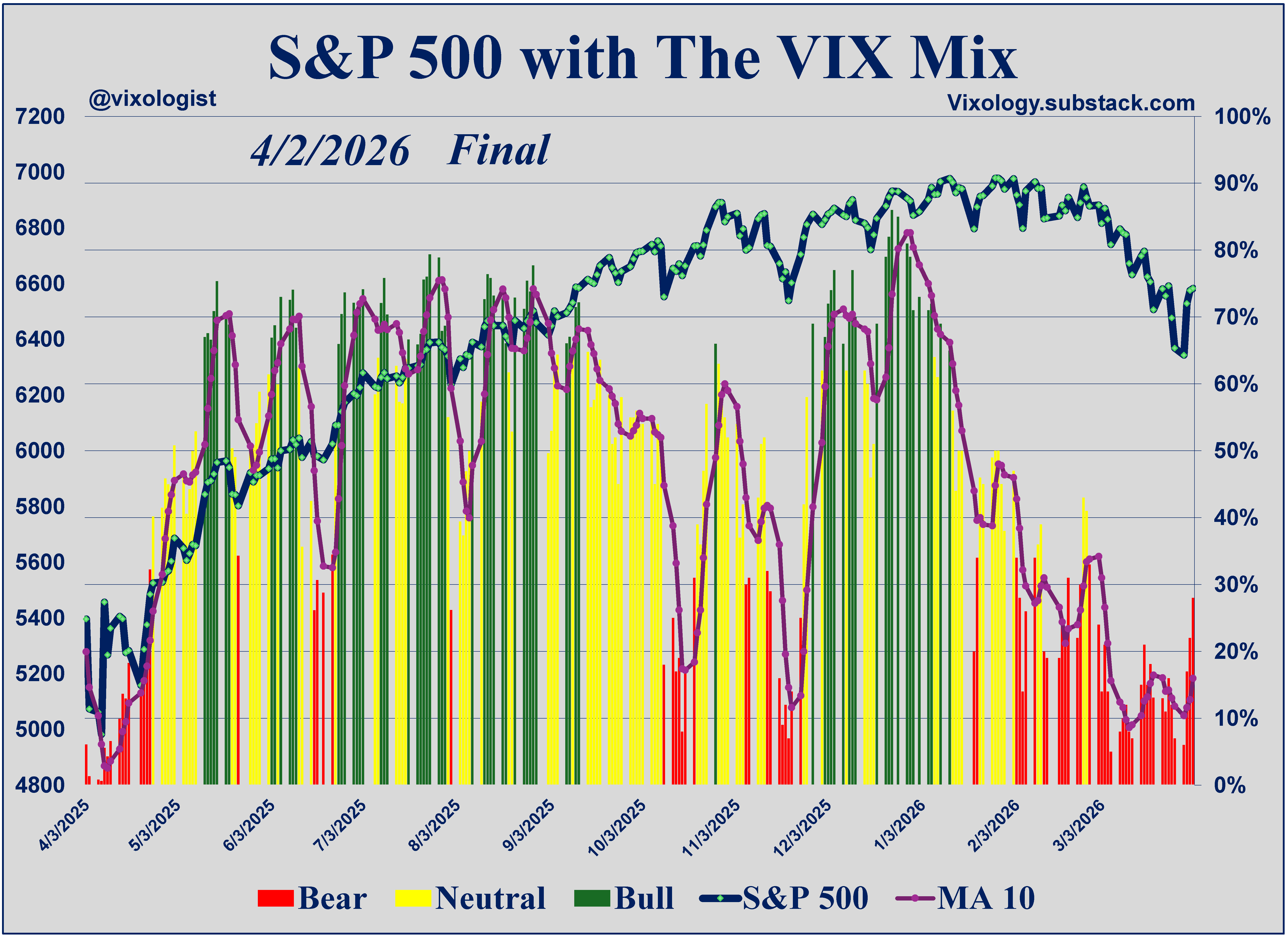 Regular readers will note that we’ve added something to our timeline chart of the VIX Mix. That purple line is a 10-day simple moving average that outlines the trends. We’re doing some research to tease out what these trends might tell us. For example, there’s a double bottom with a higher low on the right side of the chart. Maybe markets have factored in the impact of the war and are ready to move on. We’ll be watching.