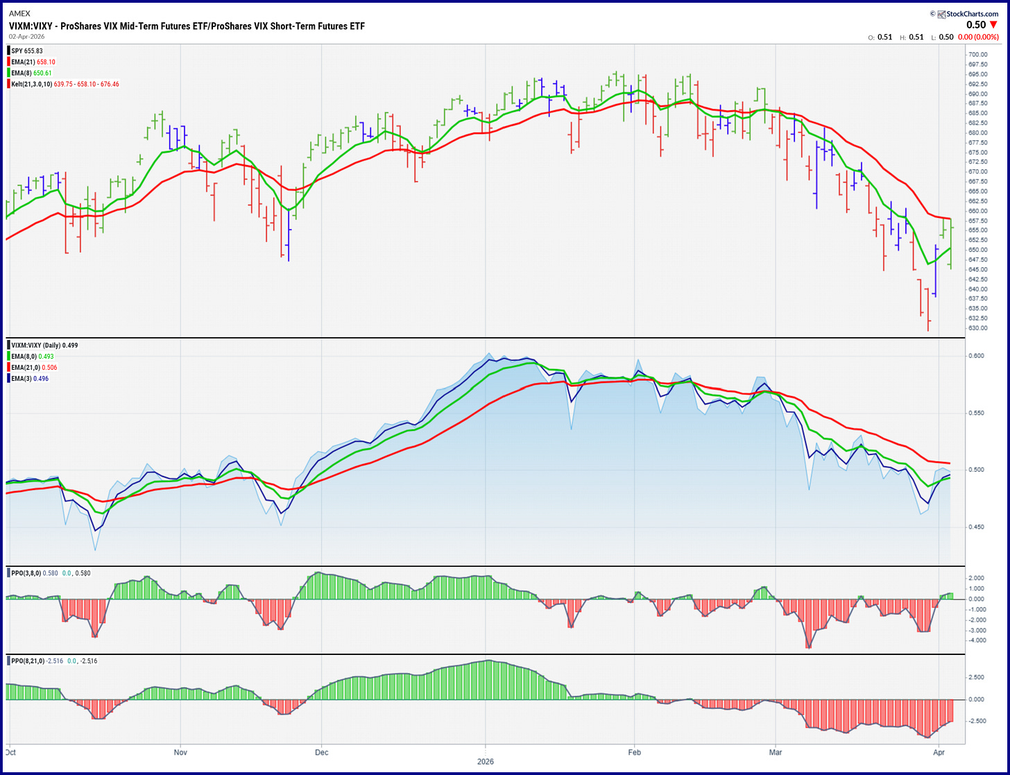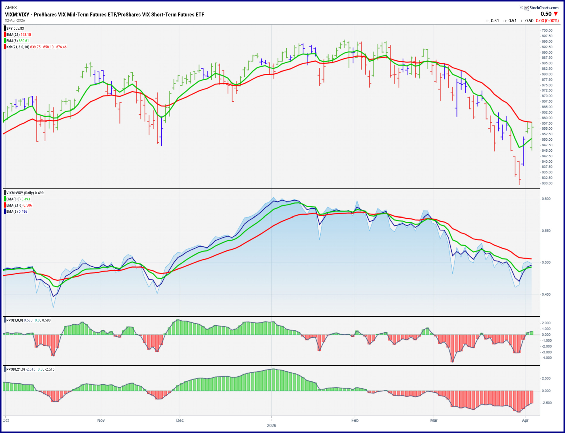 Looking at our “go to” chart of VIXM (mid-term VIX futures) to VIXY (short-term VIX futures), we can visualize the repair work done to both the S&P 500 (8-day EMA curling up) and the vol ratio (bullish crossover of shorter term EMAs).