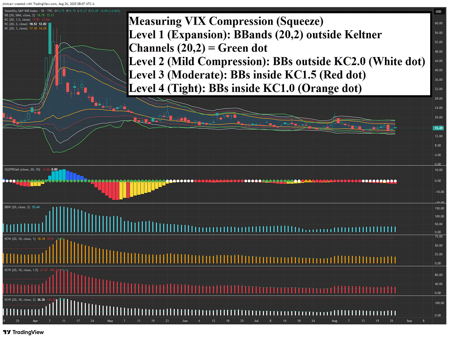 It’s been a minute since we offered up a status report on the VIX squeeze. The chart below includes a description of the four levels we use to characterize the strength of the squeeze. You can see that we are in a mild compression right now. The clock is still ticking on a determined breakout from the range we’ve been in for a month.