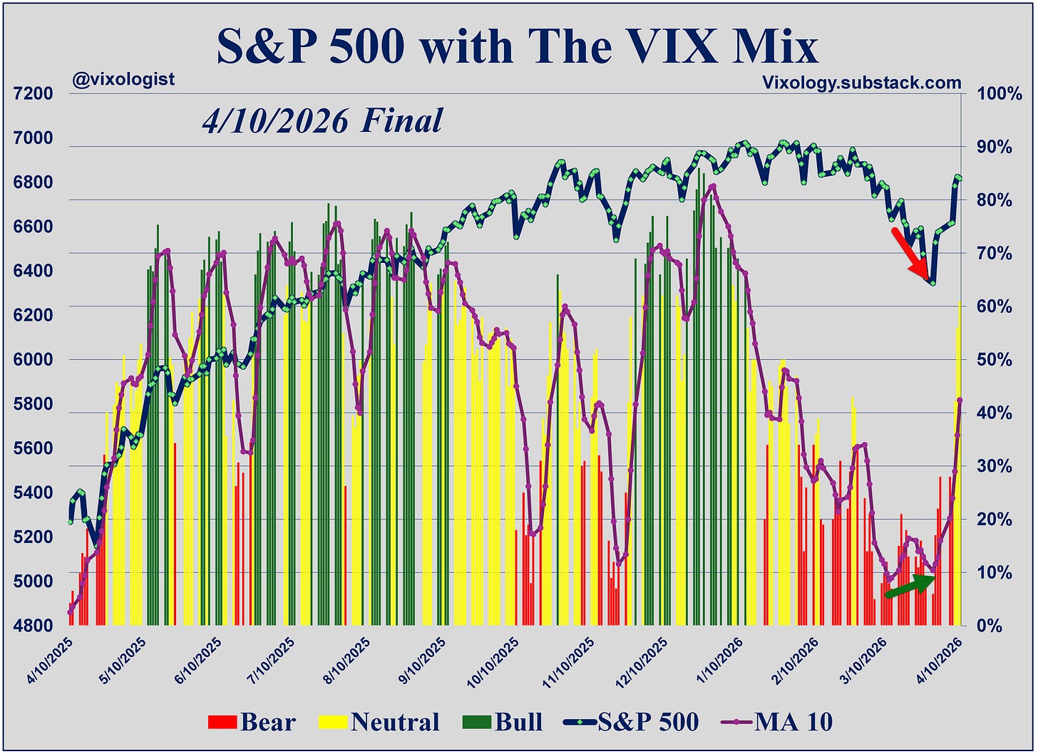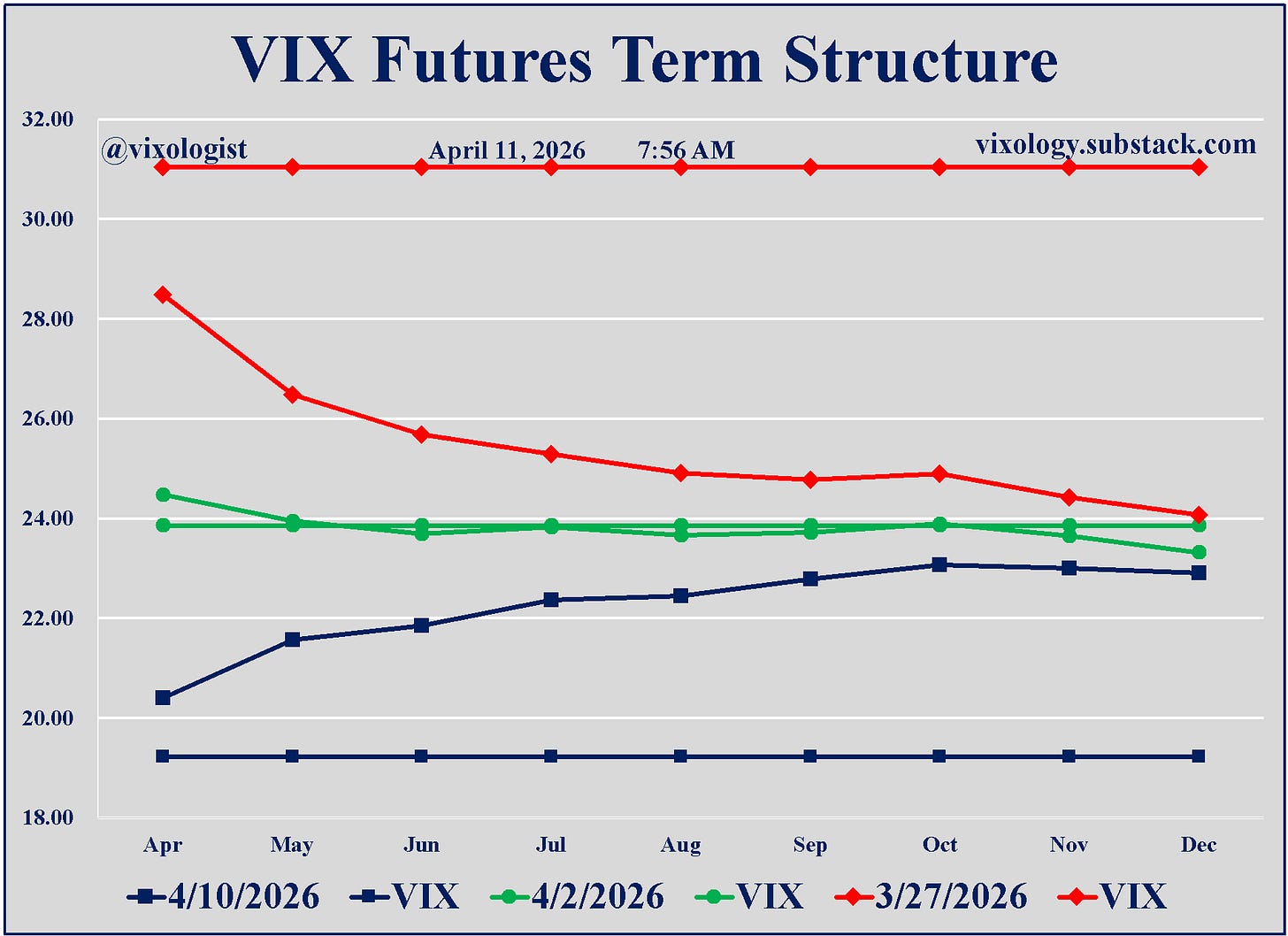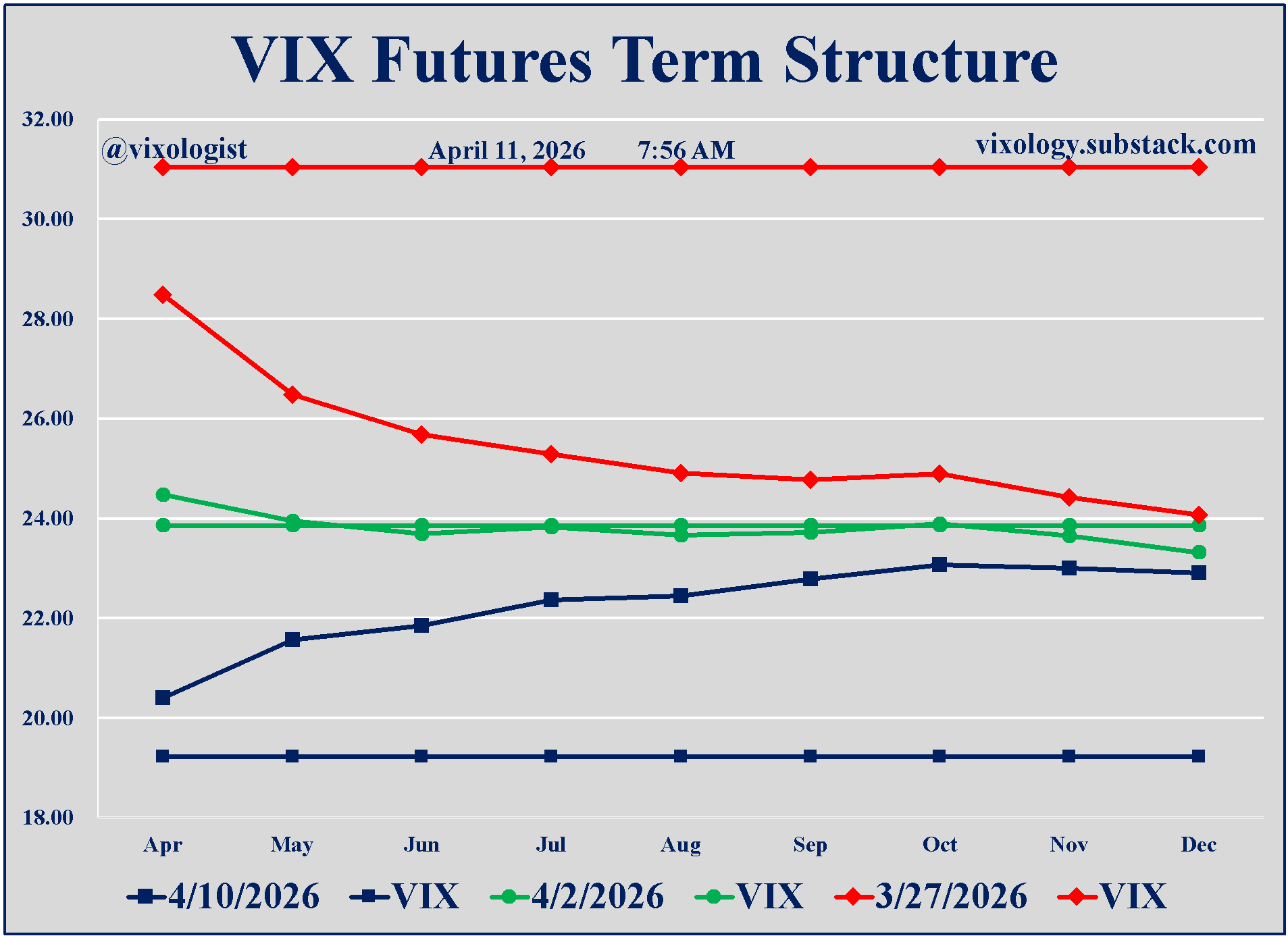 The VIX futures term structure illustrates the dramatic change over the last three weeks. March 27th looked horrible! As we reached the three-day Easter weekend, spot VIX and the futures had reached a neutral state - not exactly bullish except when compared with the week before. Roll forward to Friday’s finish and the view is decidedly bullish - spot VIX under the futures that are in contango, albeit with less than three points from low to high.