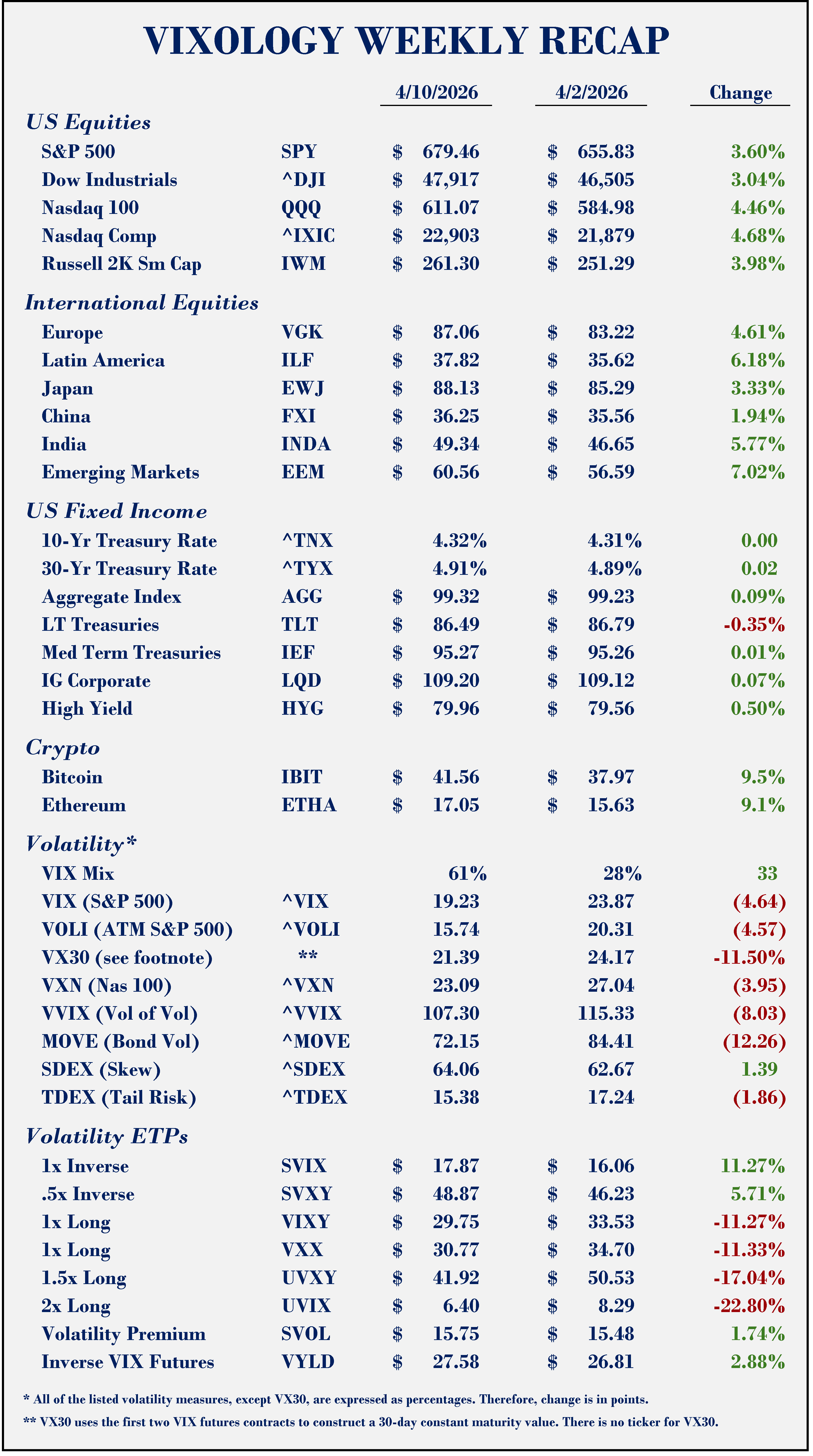 Announcement of a ceasefire in the Middle East was the rocket fuel that markets had been hoping for. US equity indices all finished at least 3% higher on the week and the international side was even better with the exception of China. Short volatility was the play of the week with SVIX finishing better by more than 11%.