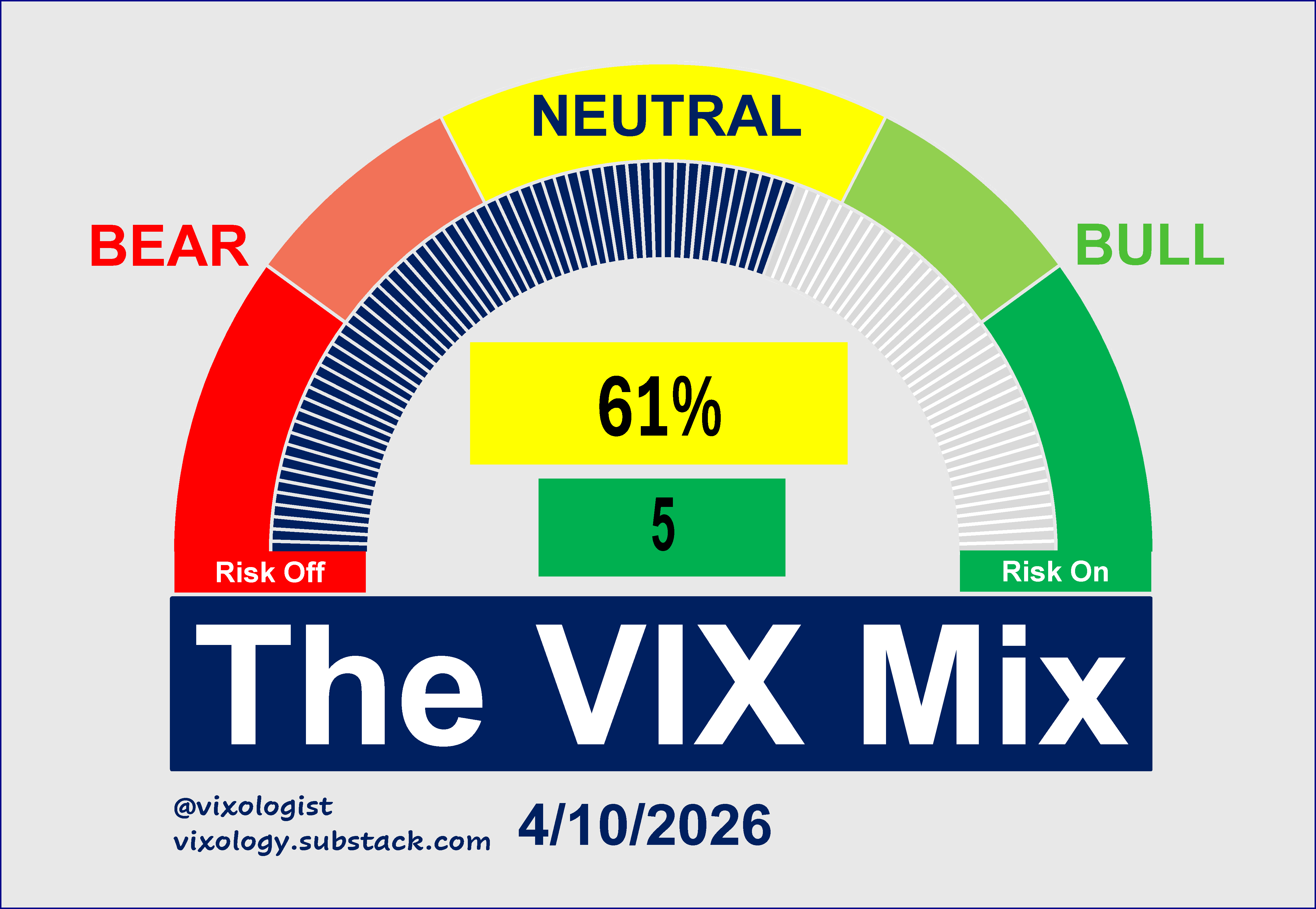 The VIX Mix was seen running along with equity markets and finished the week up 33 points to a not-quite bullish 61% (the green border sits at 65%). Bullish indicators moved from zero to nine while the bearish count fell from 12 to three.