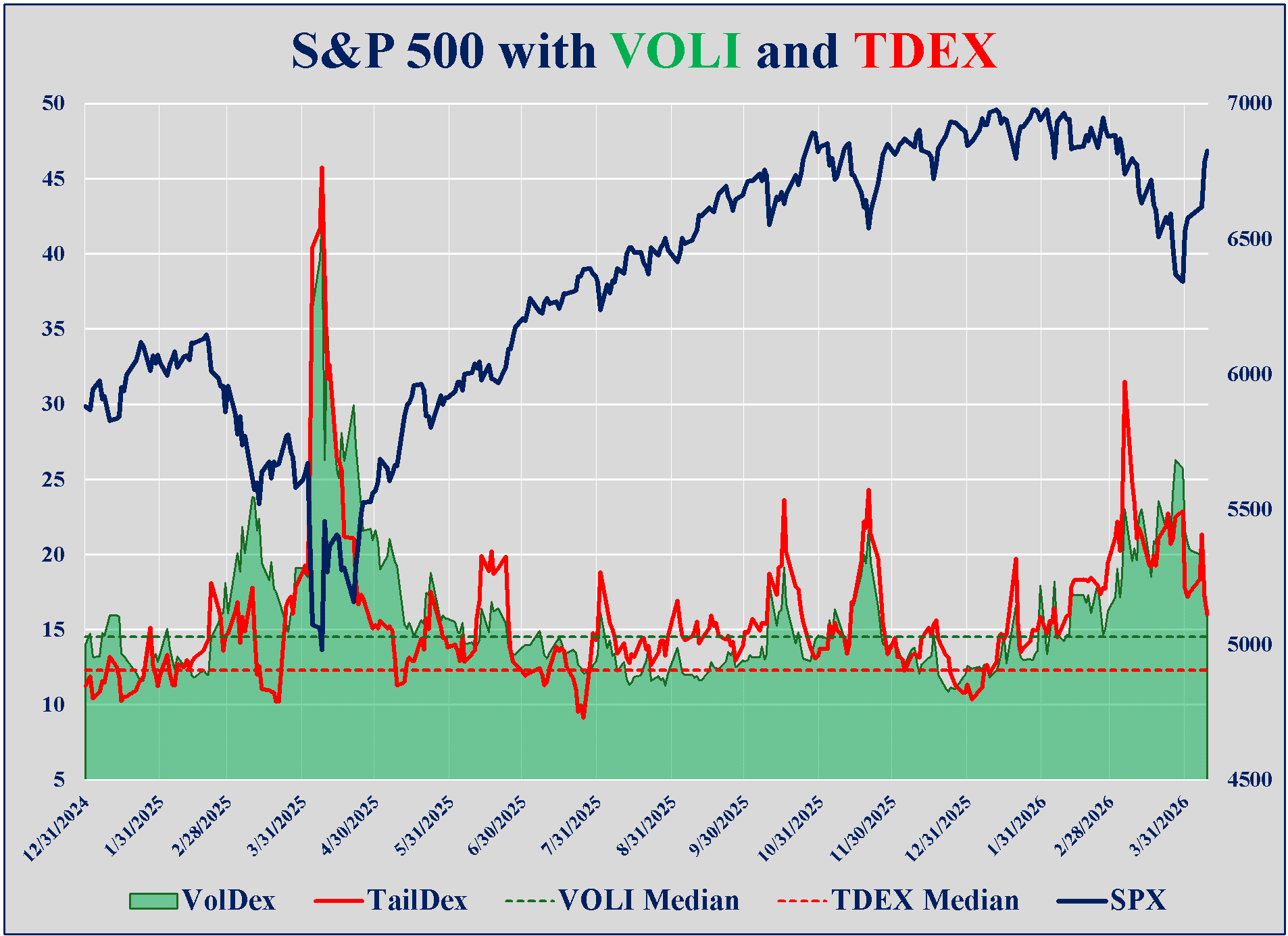 What’s interesting to me about the recent action is how TDEX spiked and peaked early in the Middle East conflict and did not come close to that level when SPX hit bottom. TDEX peaks tend to line up with SPX bottoms, but this time investors felt that the peak risk had passed. That proved to be bullish. At the same time, those hedges shifted to at-the-money positioning (VOLI) that would start to pay right away.