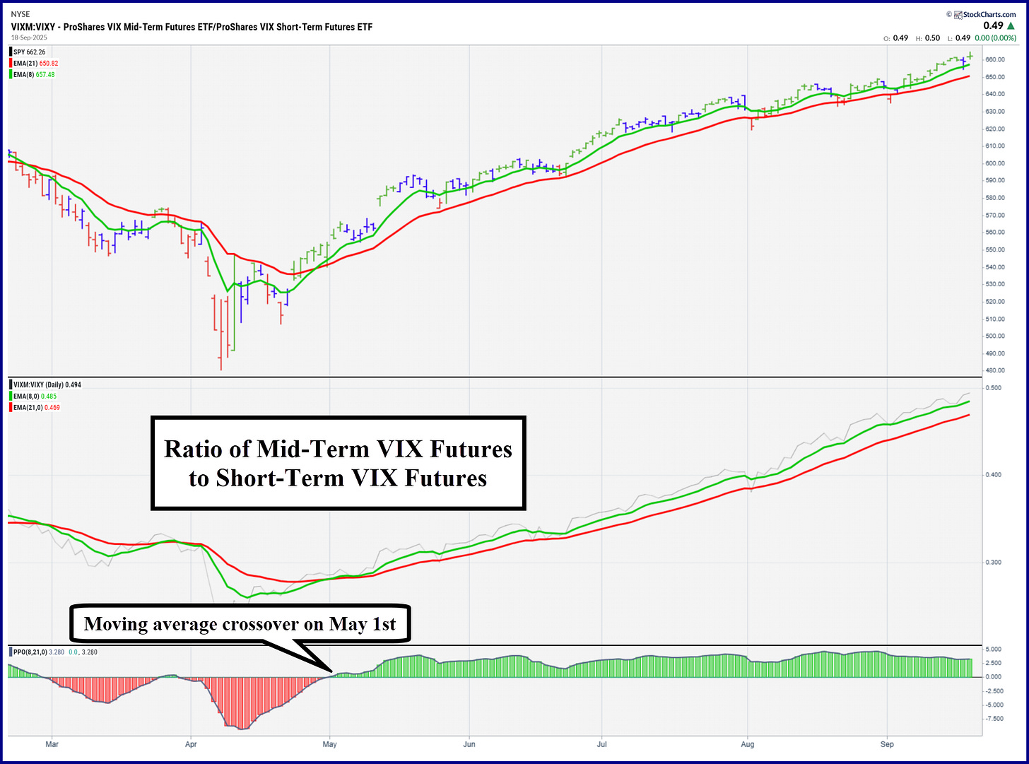 One of the indicators we pay close attention to is a derivative of the VIX futures term structure that looks at the ratio of mid-term futures (captured by the ETF $VIXM) and short-term futures (captured by $VIXY). We take the ratio and filter the daily noise with 8-day and 21-day exponential moving averages and plot crossovers. As shown below, the most recent cross was back on May 1st and that bullish condition has not wavered since then. You can see in the top pane that the 8/21 crossover on SPX came at the same time (actually a day earlier). We would not recommend this as a stand-alone trading signal, but it’s pretty useful to know if you’re in the green or the red. For the moment, it’s steady as we go.
