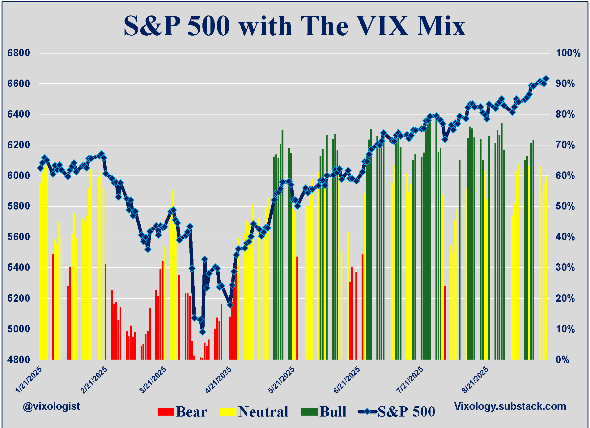 It would be nice to have the VIX Mix back at a bullish reading, but there is still some caution that accompanies being steady as we go. We made a little progress yesterday and could get back into the green with another good day or two.
