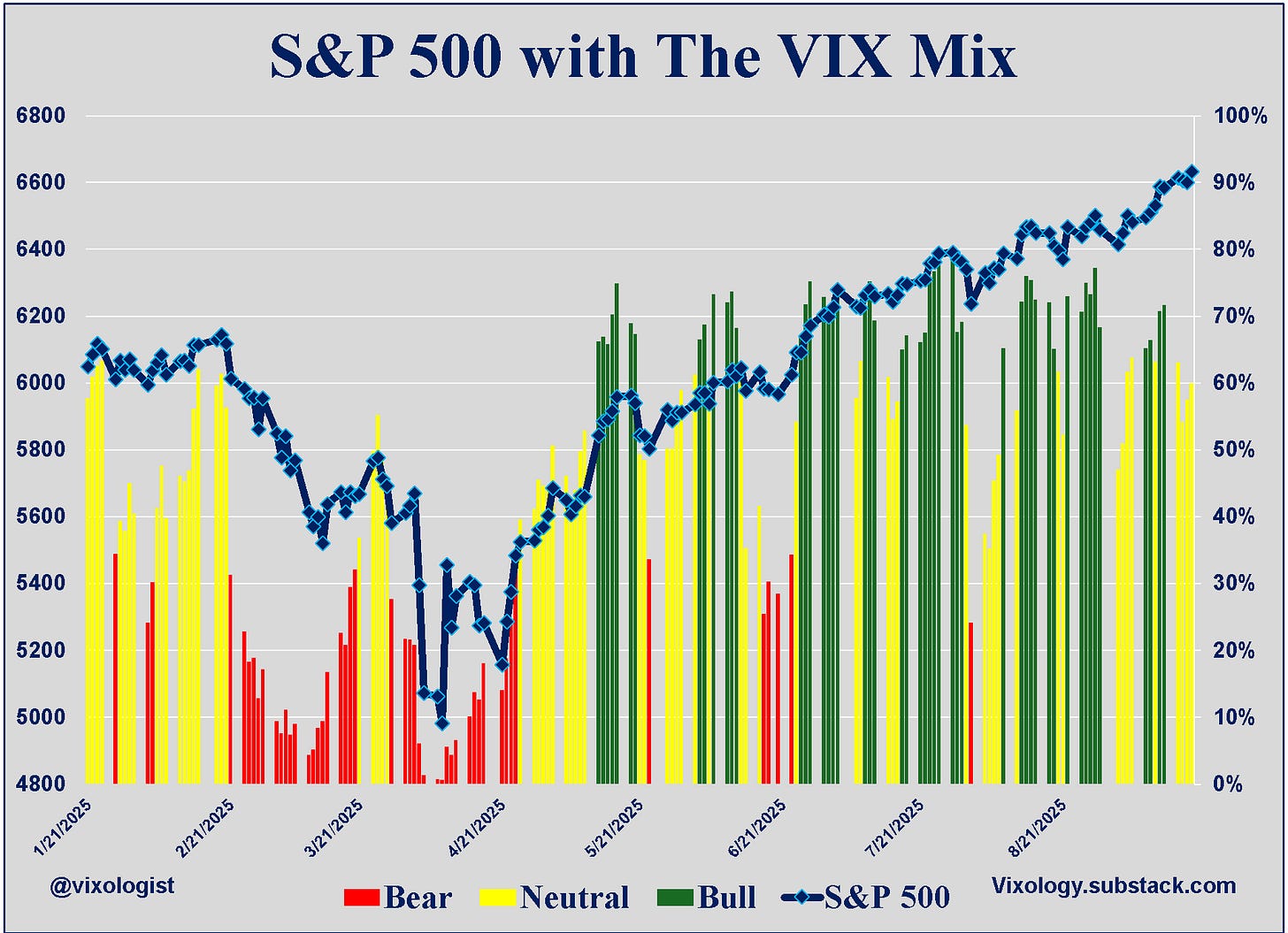 Ten of the 17 components are on the bullish end and only two are bearish. The bull case for equities definitely needs the improvement to continue. A persistent divergence between all-time highs for SPX and neutral readings for VIX Mix would be a bad sign.