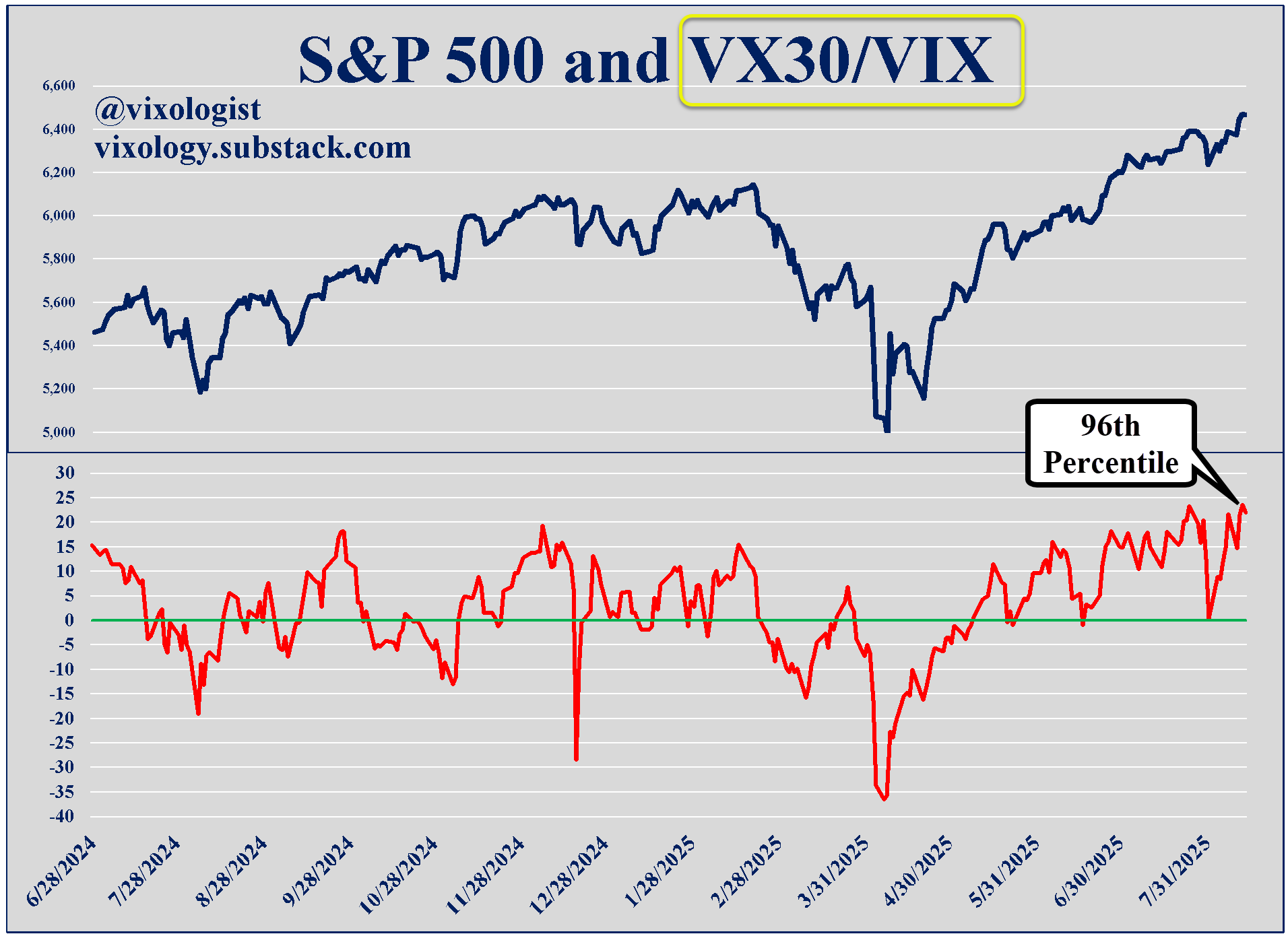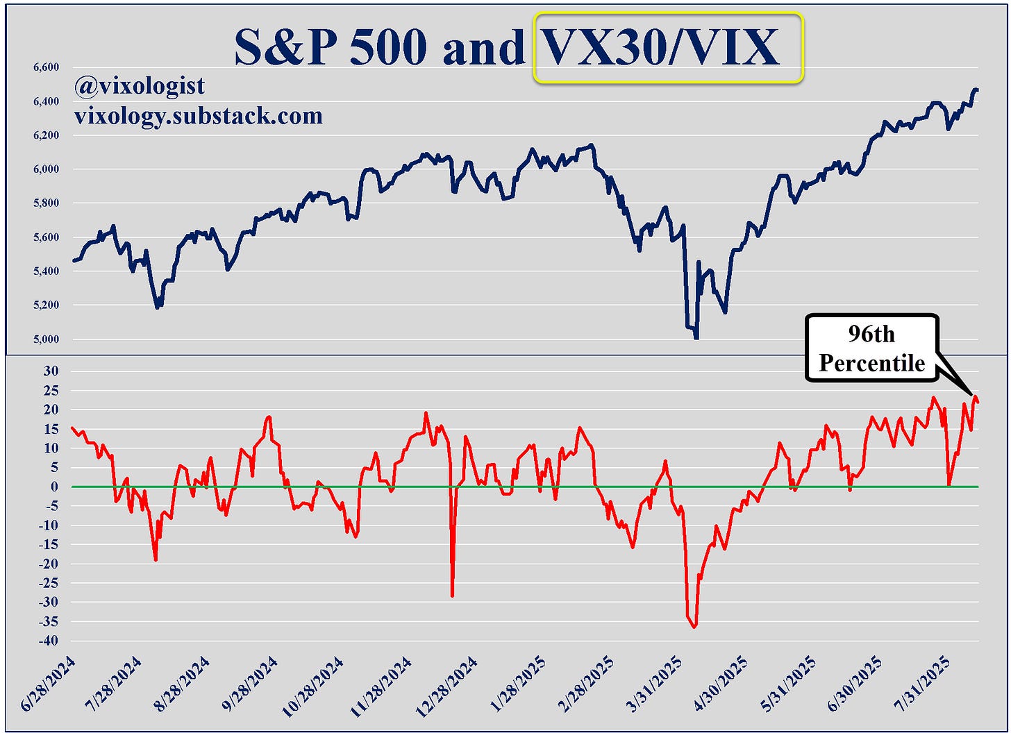 The first chart below has racked up more than 55k views on X/Twitter. You never know what will strike a chord with the #FinTwit community. If you didn’t see it, the red line maps the ratio of VX30 to spot VIX. VX30 is a measure of constant maturity VIX futures calculated using the front two monthly contracts weighted by days to expiration. As highlighted, we finished yesterday with this relationship at the 96th percentile of values that go back to the introduction of VIX futures back in 2004. We are stretched! That doesn’t mean that stocks will crash from here. Conditions may be “overbought” but they can stay that way for a while if only to punish the bears.